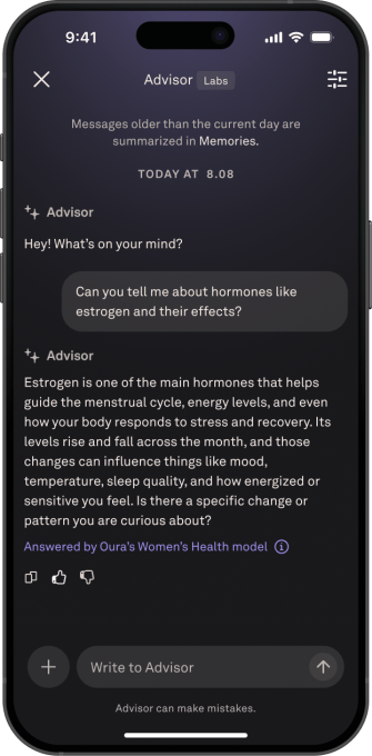 When a user asks Oura Advisor a women’s health question, the chatbot prompts the new model to reference its research and knowledge sources while also analyzing the user’s relevant biometric signals across sleep, activity, cycle, and pregnancy data, as well as stress and more.