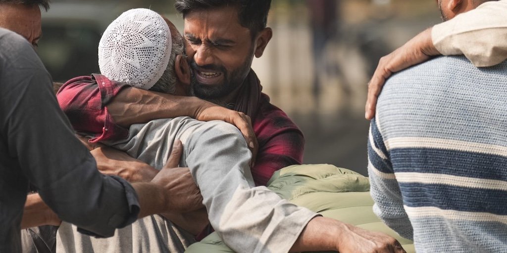 لال قلعہ کے قریب ہوئےدھماکے میں ہلاک ہونے والے نعمان کے اہل خانہ نئی دہلی میں مولانا آزاد میڈیکل کالج کے باہر مردہ خانے کے سامنے ۔ (تصویر: پی ٹی آئی)