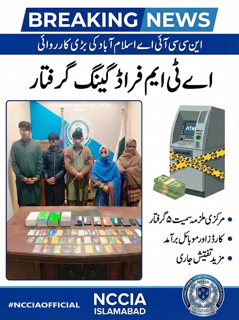 اسلام آباد: نیشنل سائبر کرائم انویسٹی گیشن ایجنسی (این سی سی آئی اے) کے سائبر کرائم سرکل اسلام آباد نے کارروائی کرتے ہوئے اے ٹی ایم فراڈ میں ملوث ایک منظم گروہ کے ارکان کو گرفتار کر لیا ہے۔