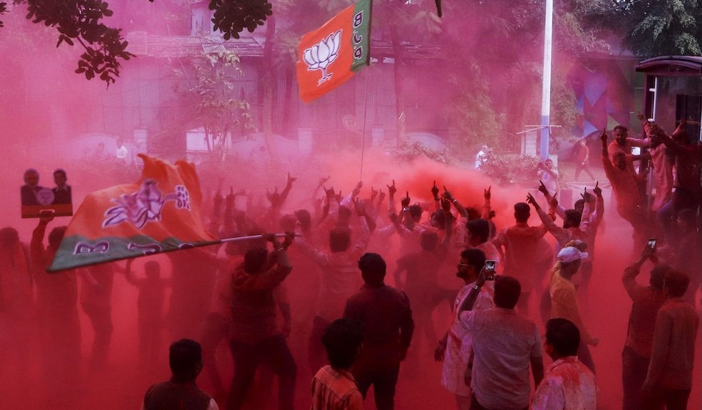 بی جے پی کارکن ممبئی میں پارٹی دفتر میں 2026 کے بی ایم سی انتخابات میں جیت کا جشن مناتے ہوئے۔ (تصویر: پی ٹی آئی)