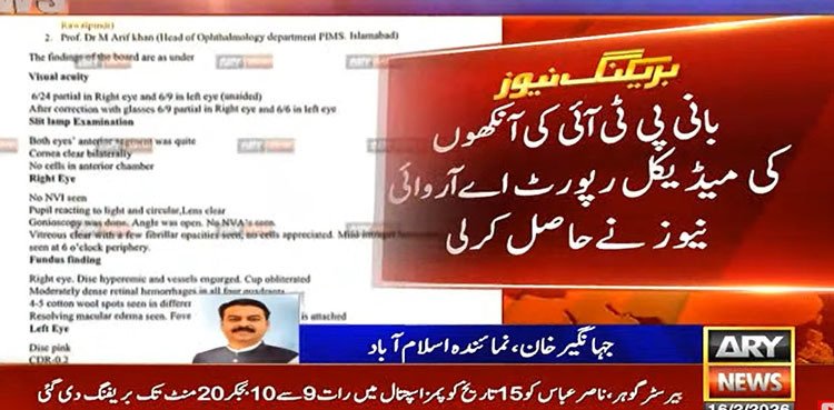 ISLAMABAD: A medical report on the eye condition of Pakistan Tehreek-e-Insaf (PTI) founder, Imran Khan, has been obtained by ARY News, detailing findings of a medical board examination conducted on February 15, 2026.