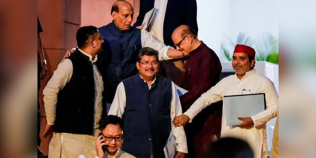گزشتہ25مارچ کو نئی دہلی میں مغربی ایشیا بحران پر تبادلہ خیال کے لیے حکومت کی جانب سے بلائی گئی آل پارٹی میٹنگ کے بعد وزیر دفاع راجناتھ سنگھ، کانگریس کے رکن پارلیامنٹ مکل واسنک اور طارق انور، سماج وادی پارٹی کے رکن پارلیامنٹ دھرمیندر یادو سمیت دیگر باہر نکلتے ہوئے۔ (تصویر: پی ٹی آئی/روی چودھری)