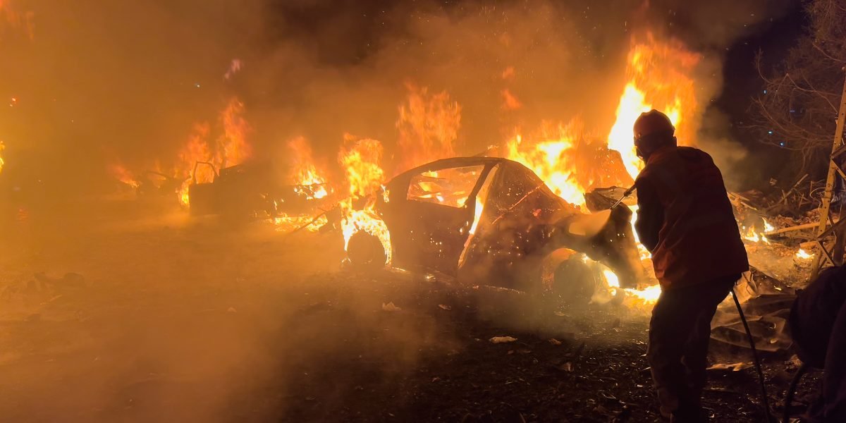 گزشتہ 1 اپریل 2026 کو لبنان کے دارالحکومت بیروت میں اسرائیلی فضائی حملوں کے بعد جائے وقوعہ پر ایک فائر فائٹر گاڑی میں لگی آگ بجھاتا ہوا۔ (فوٹو: اے پی/پی ٹی آئی)