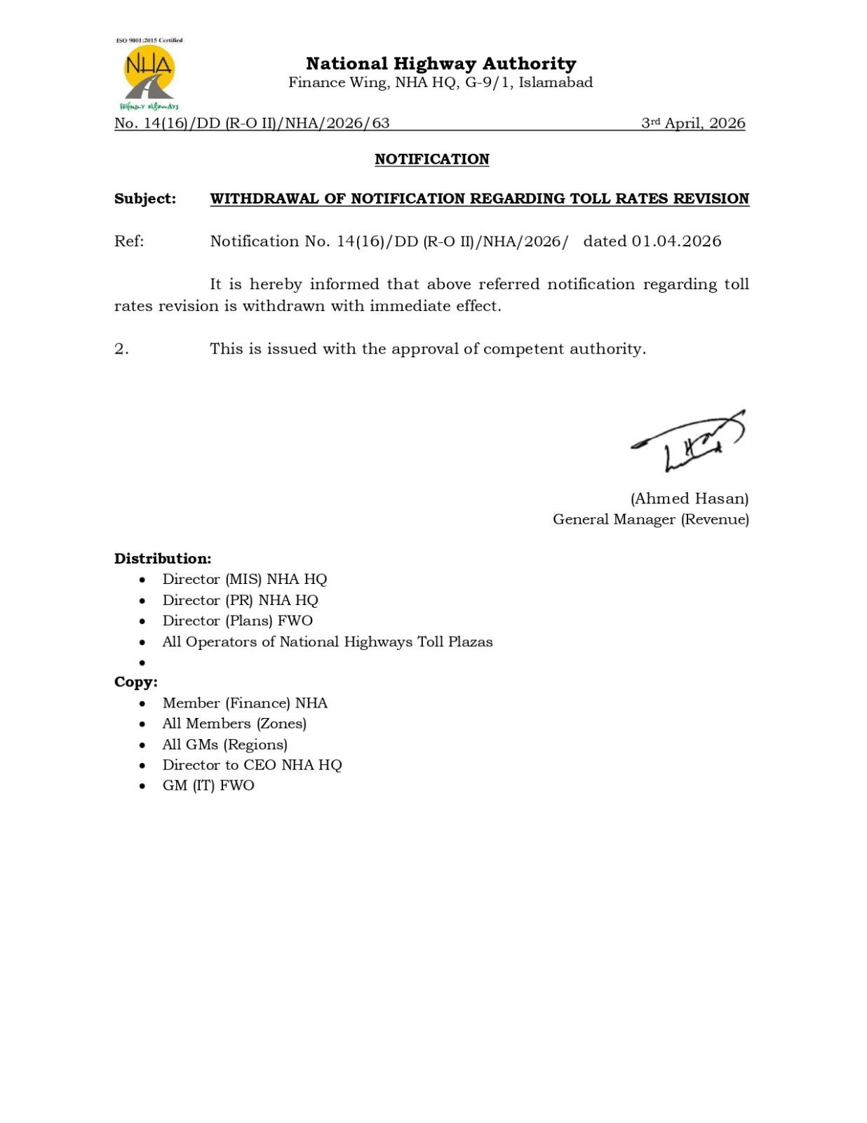 An official notification issued by the National Highway Authority (NHA) on April 3, 2026, formally withdrew its earlier notification dated April 1, 2026, regarding the revision of toll rates. The withdrawal takes immediate effect.